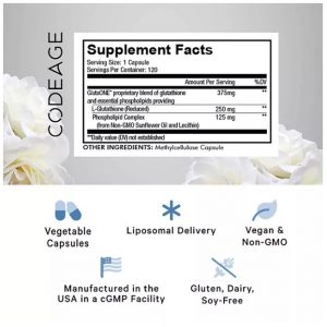 - Bổ sung l-glutathione thuần chay này cũng không chứa chất mang và thành phần nhân tạo. Mỗi lọ Codeage Liposomal Glutathione 250 mg đi kèm với 4 tháng sử dụng sản phẩm.