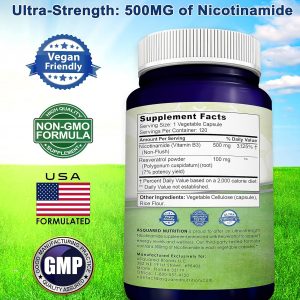 - Chất bổ sung Nicotinamide có sức mạnh tối đa của chúng tôi chứa 500mg vitamin B3 không chứa nước trong mỗi viên rau và được tăng cường với 100mg bột Resveratrol (hiệu suất 7%) để tăng cường sức khỏe và sửa chữa tế bào, mức NAD bình thường, tuổi thọ và sức khỏe. Khu phức hợp mạnh mẽ của chúng tôi chứa chất chống oxy hóa mạnh mẽ.