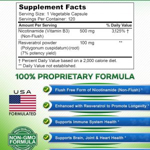 - Nicotinamide không chứa chất tẩy rửa và không nên nhầm lẫn với Niacin hoặc axit nicotinic. Phức hợp độc quyền của chúng tôi chứa 500mg Nicotinamide & 100mg bột Resveratrol (hiệu suất 7%) để giúp kích hoạt protein sirtuin, hỗ trợ mức NAD / NAD+ bình thường (Nicotinamide adenine dinucleotide) và hỗ trợ sức khỏe và tuổi thọ của tế bào.