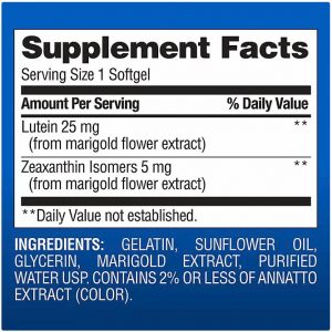 - Viên nang mềm Lutein và Zeaxanthin Member’s Mark của chúng tôi không chứa thuốc nhuộm tổng hợp, lactose, gluten, hương vị nhân tạo, đường và muối. Sản phẩm chứa 25 miligam lutein và 5 miligam zeaxanthin có nguồn gốc từ chiết xuất hoa cúc vạn thọ. Người lớn nên uống một viên nang mềm mỗi ngày cùng với thức ăn như một chất bổ sung chế độ ăn uống.