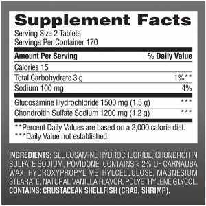 Thành phần: Glucosamine Hydrochloride, Chondroitin Sulfate Sodium, Povidone, Sáp Carnauba, Hydroxypropyl Methylcellulose, Magnesium Stearate, Hương vani tự nhiên, Polyethylene Glycol. Chứa: Động vật giáp xác (Cua, Tôm)
